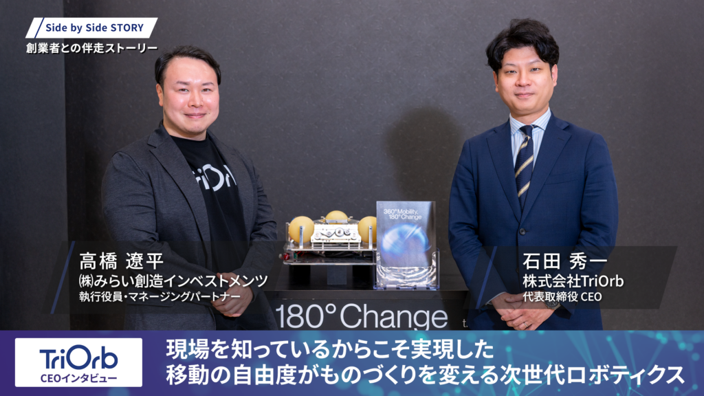 今回は、球を用いた独自の全方向移動機構によって“移動の常識”を根底から変えようとしている 株式会社TriOrb 代表取締役CEO 石田秀一さん、そして社外取締役として伴走支援を行うみらい創造インベストメンツ 高橋遼平さんにお話を伺いました。研究の出発点から産業実装への視点転換、ビジョン「Holonomic World」に込めた思想、そして事業の節目で示された伴走支援の核心に迫ります。