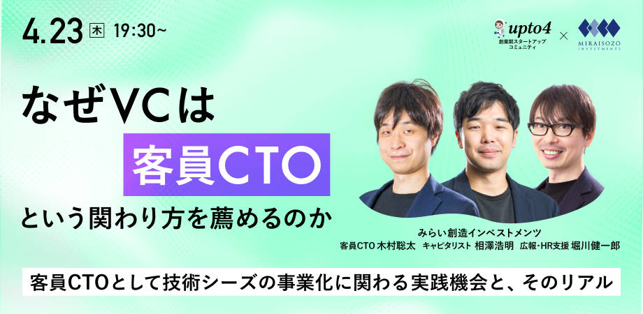 みらい創造インベストメンツは、upto4株式会社(代表取締役:棟兼彰一)との共催により、大学発スタートアップにおける新たな関わり方として注目される「客員CTO」をテーマとしたイベント「なぜVCは『客員CTO』という関わり方を薦めるのか ─ 大学発スタートアップCxOを目指す新しいキャリア戦略 ─」を4月23日に開催します。