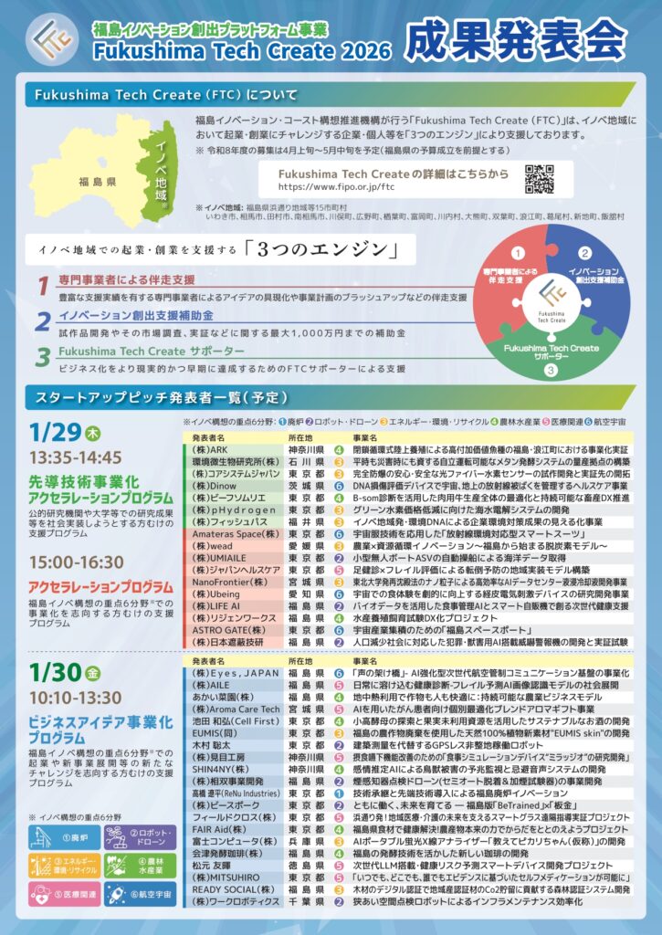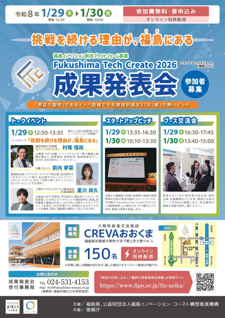 福島県「Fukushima Tech Create(FTC)」事業により、公益財団法人福島イノベーション・コースト構想推進機構(以下、「福島イノベ機構」)が実施する「Fukushima Tech Create 2026 成果発表会」に、弊社がVCブース交流会に出展します。このイベントは、福島県浜通り地域等において、起業・創業を目指す個人・企業の方を支援する事業プログラムで、令和7年度に採択された37社(者)が事業内容やプログラム成果を発表を行うものです。また、弊社は、2024年10月より福島イノベーション創出プラットフォーム事業 「Fukushima Tech Create サポーター(FTCサポーター)」として認定されています。